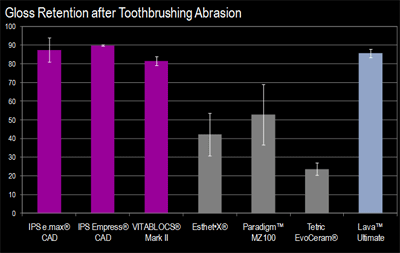 Lava™ Ultimate Restorative wears far less on opposing dentition compared to glass ceramic materials