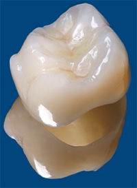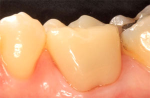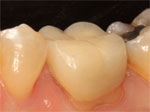 Một mão răng bị vỡ bán phần với vật liệu sứ thủy tinh được thay thế với một mão được cắt từ Lava Ultimate.