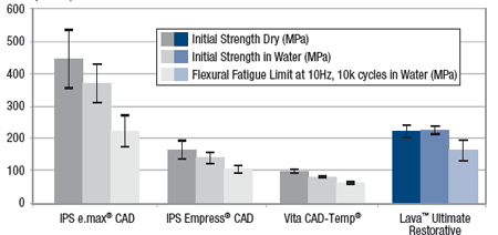 Flexural Strength is measured using dry bars of the materials. Initial strength of Lava™ Ultimate Restorative is superior to the majority of chairside materials, except IPS e.max CAD blocks.