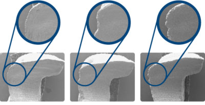 Hình ảnh phóng đại của một inlay được cắt bằng hệ thống CAD/CAM. Lava™ Ultimate cho thấy đường viền phục hình rất ít nứt vỡ hơn so với sứ thủy tinh, bao gồm lithium disilicate.